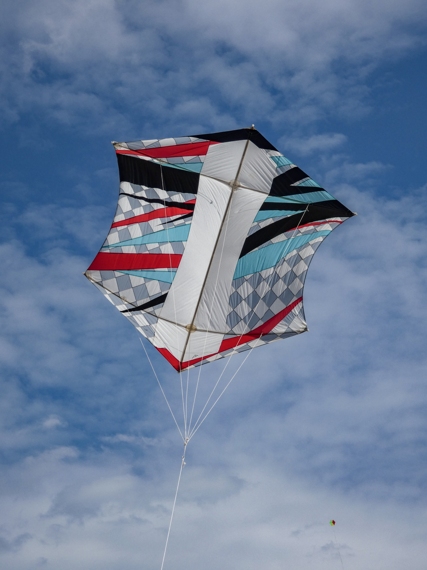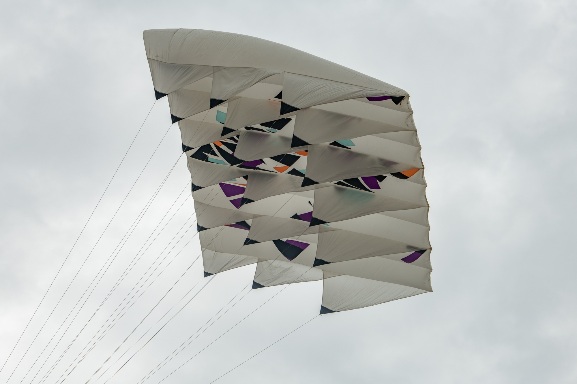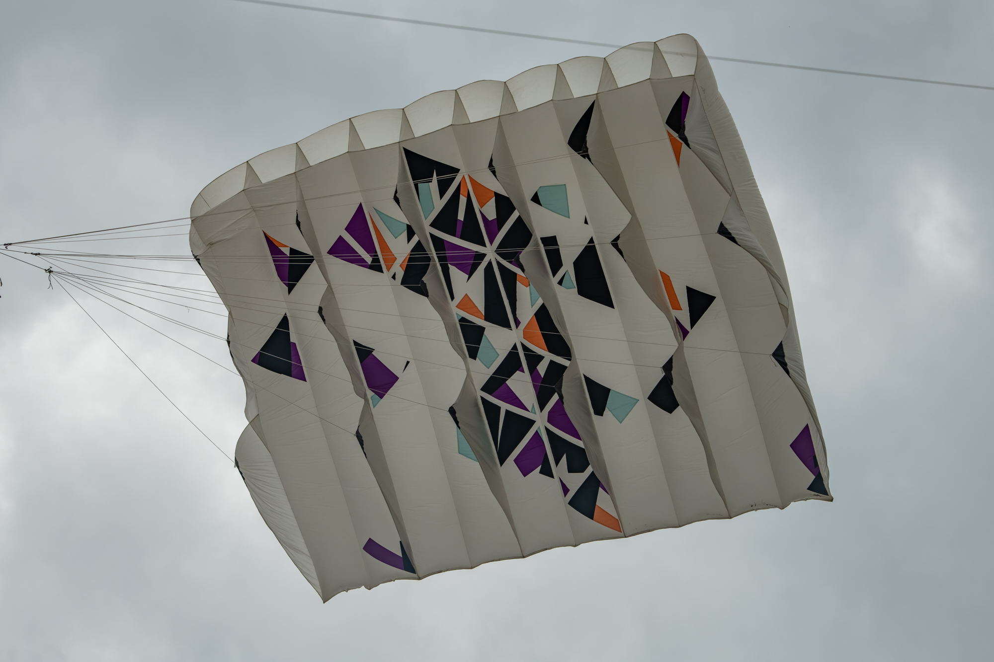 The larger kite was tending towards topping out so the flight was quite short after an interim re-launch proved to be more time consuming than it should have been. The kite was not moved far enough out of the centre of the window before inflation was attempted!