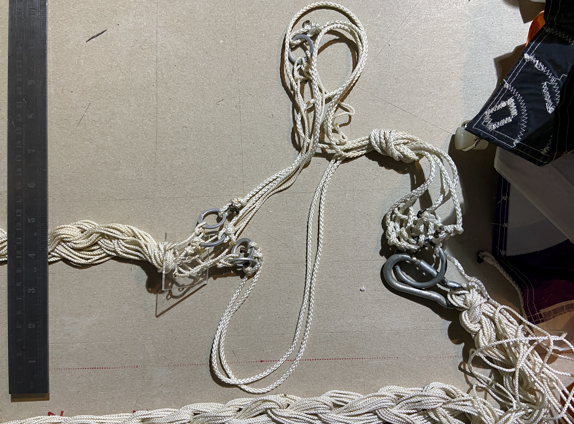 Spares made and plugged. Previously started bow lines reconfigured for larks head connections..