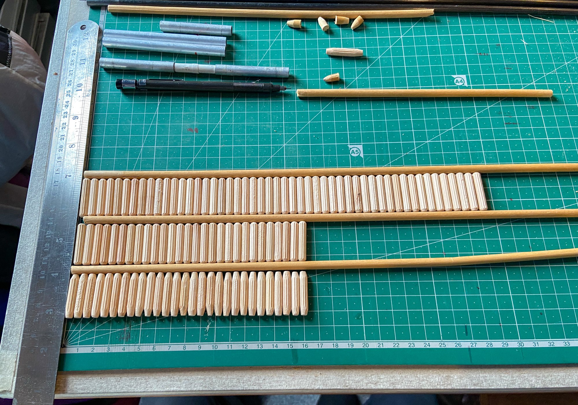 One was cut and fitted and then a few more were made and some fluted hardwood dowels ordered.