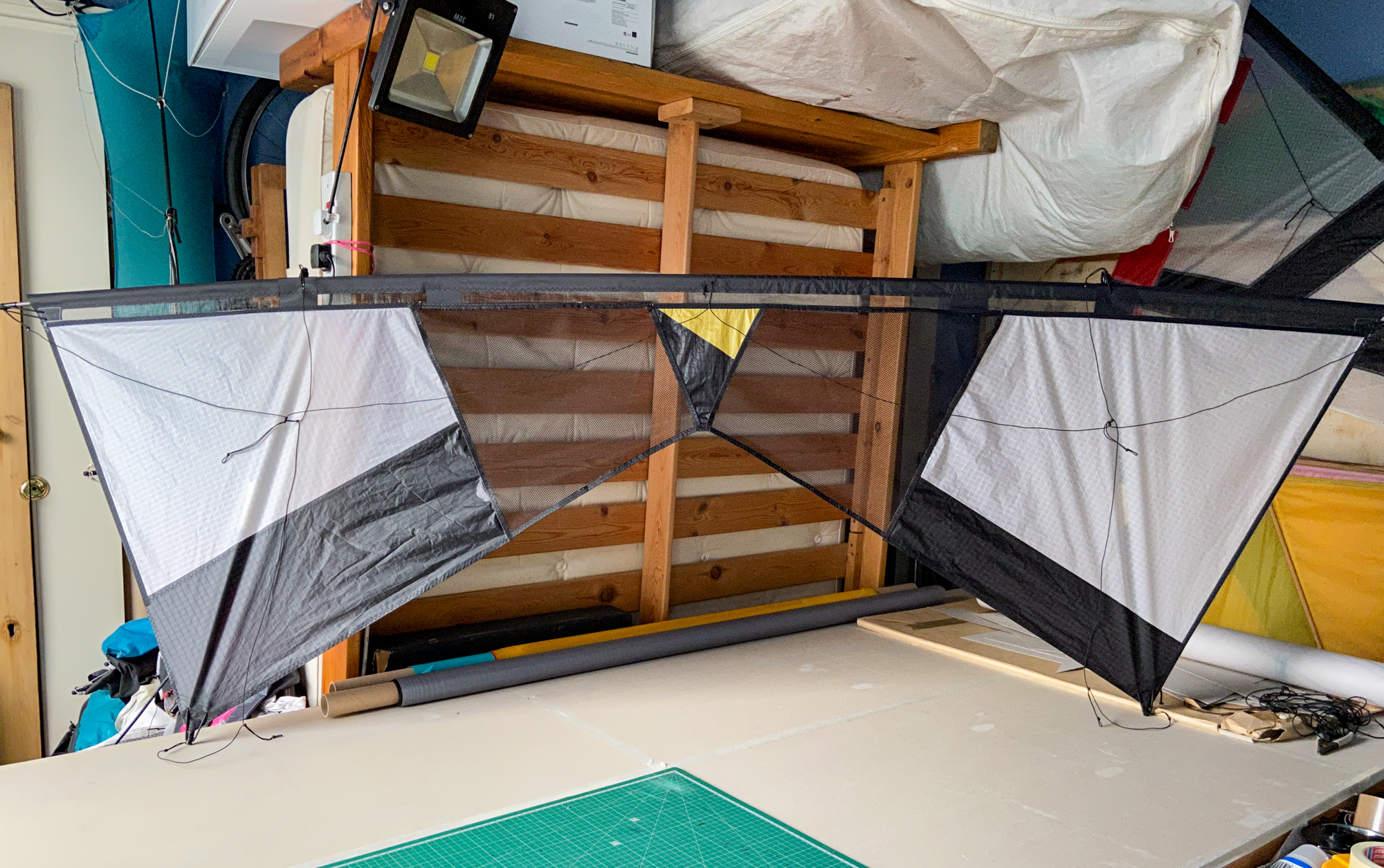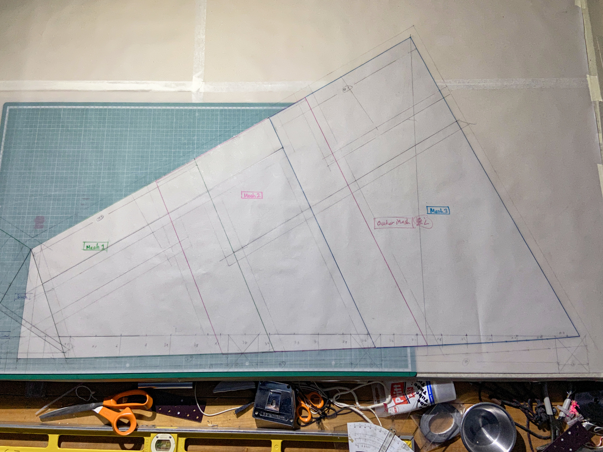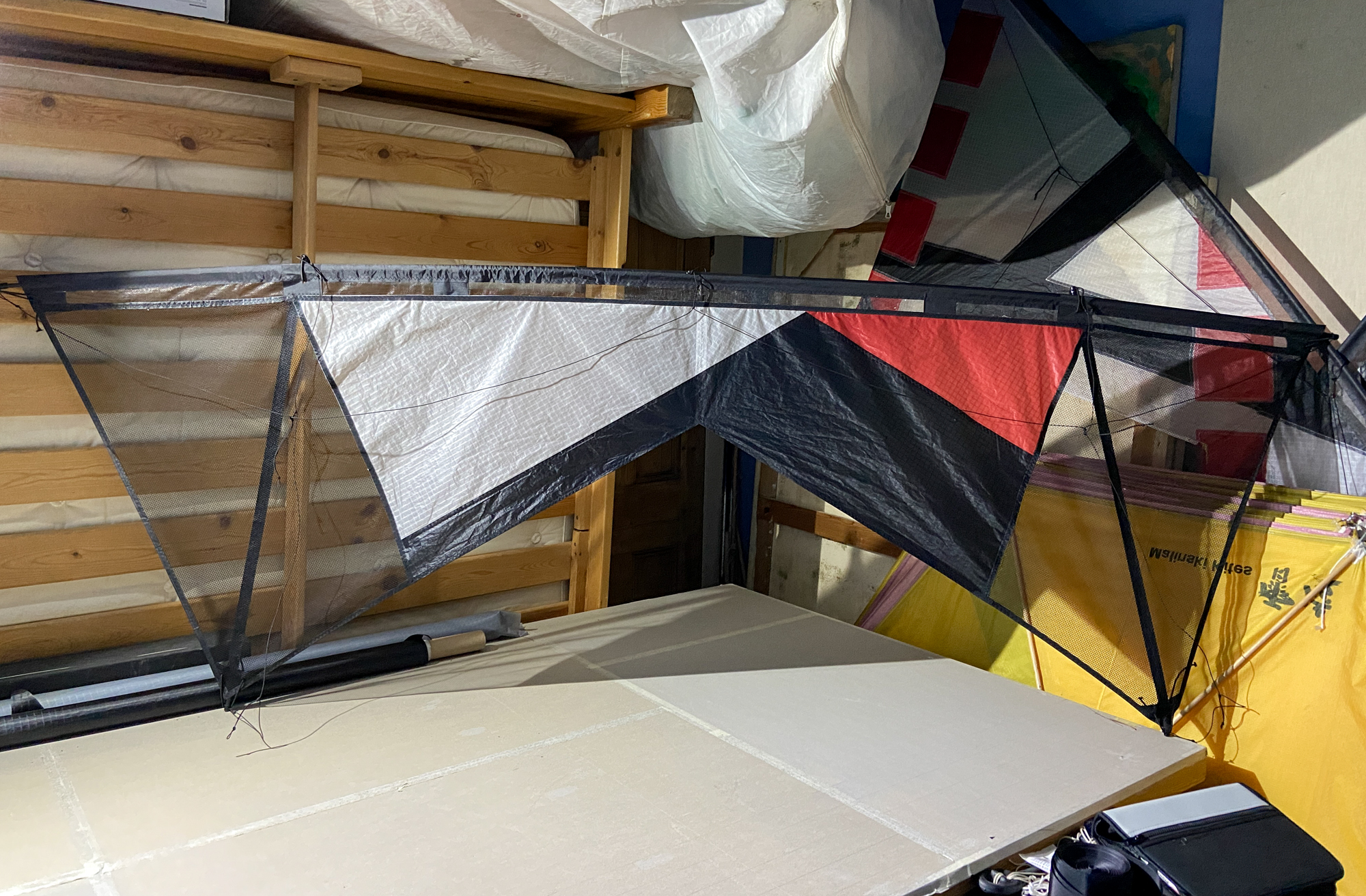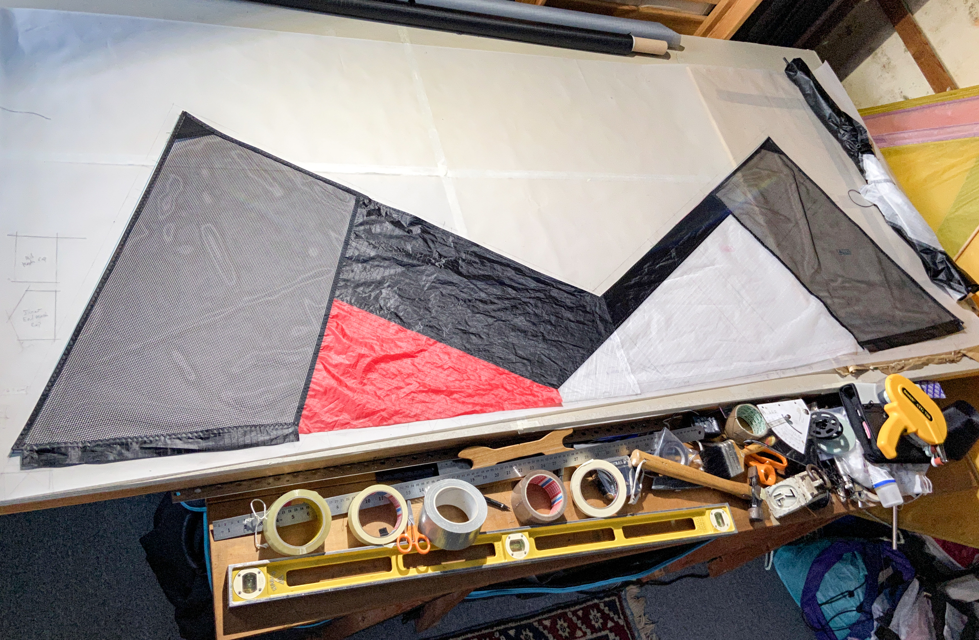 In 2022 needing a project involving the preparation of replacement leading edges I decided to re-address the original designs from 2008/2009 and 'invented' a transitional version. The project is being developed using a polyester mesh with a wider grain than the original Revolution leading edge mesh.