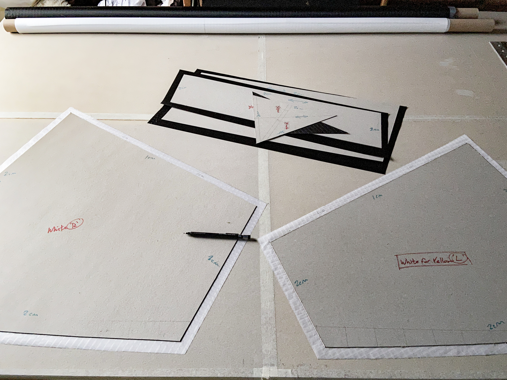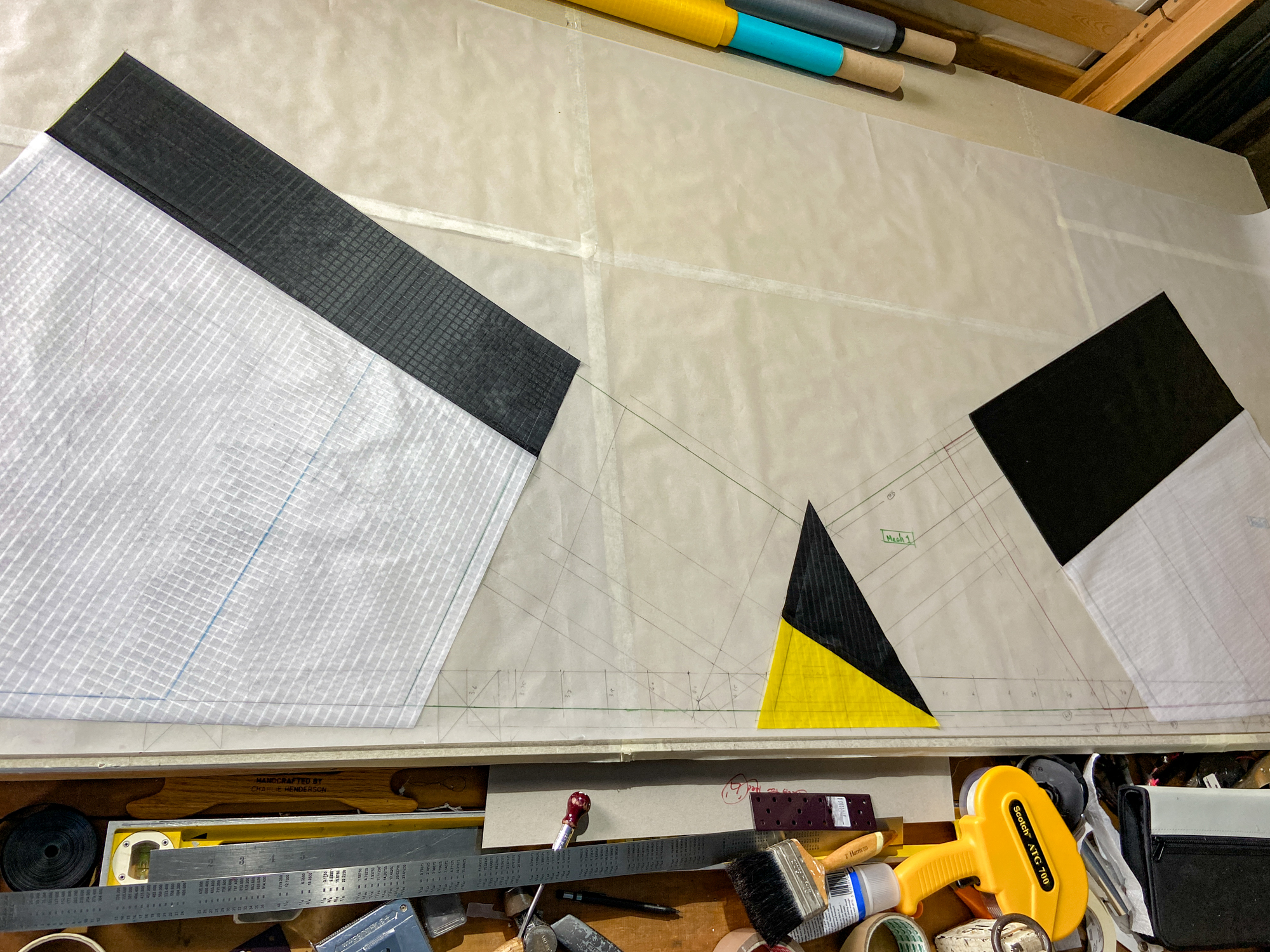 A traced outline of the Revolution 1.5 sail was started 7th September 2022 with elements of all three configurations gradually added with particular reference to the actual curved leading edge. This was used to plot the digital version which was partly filled with textural elements as at 3rd October 2022.