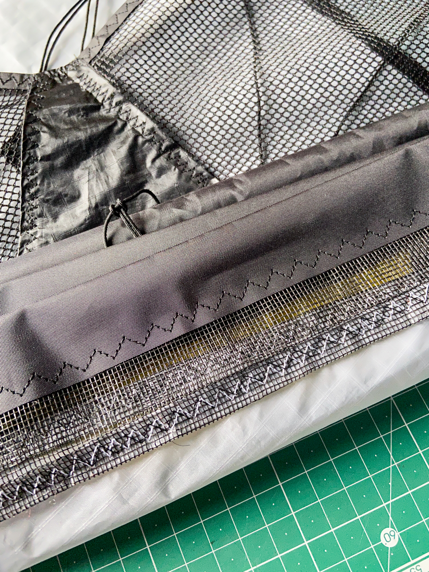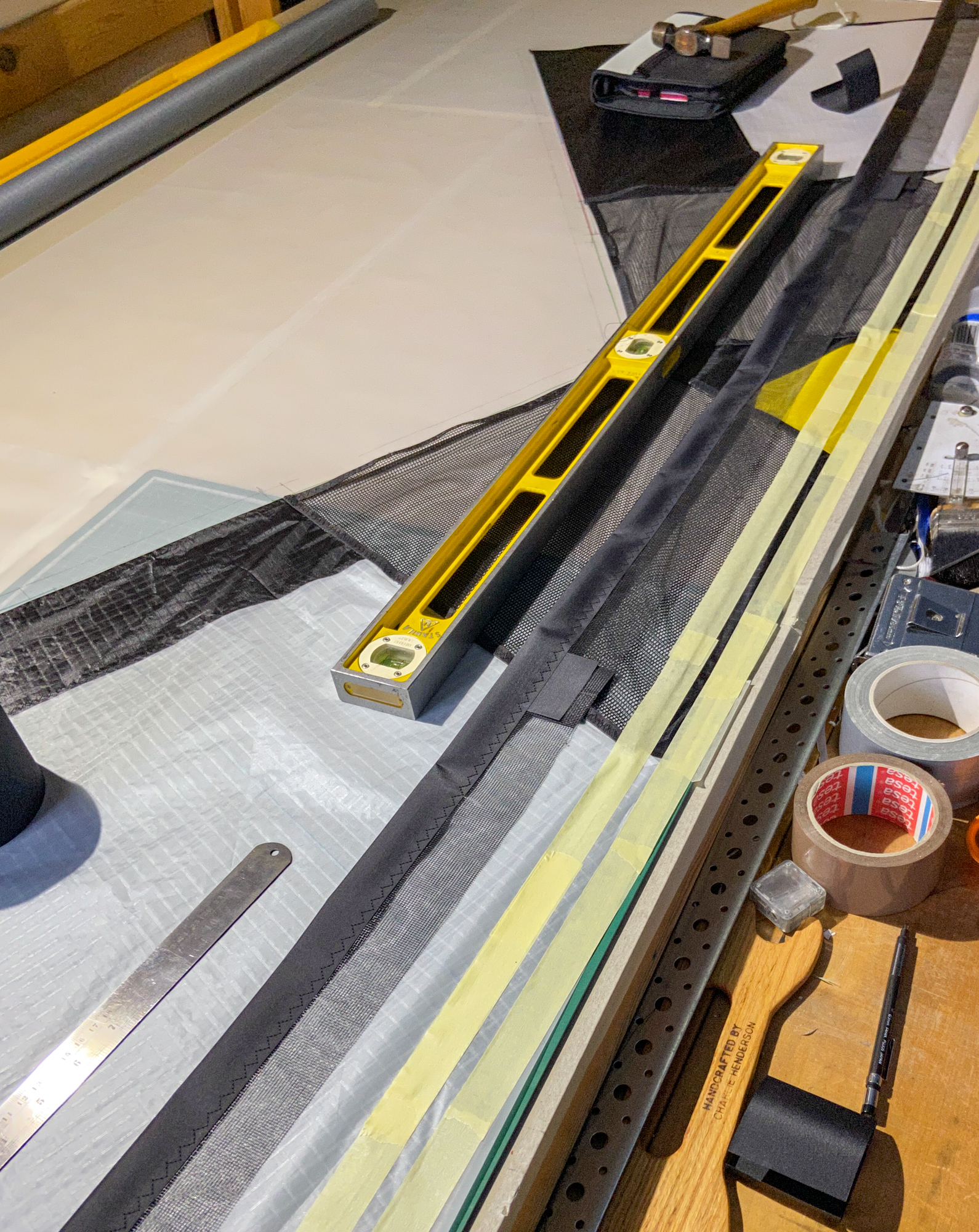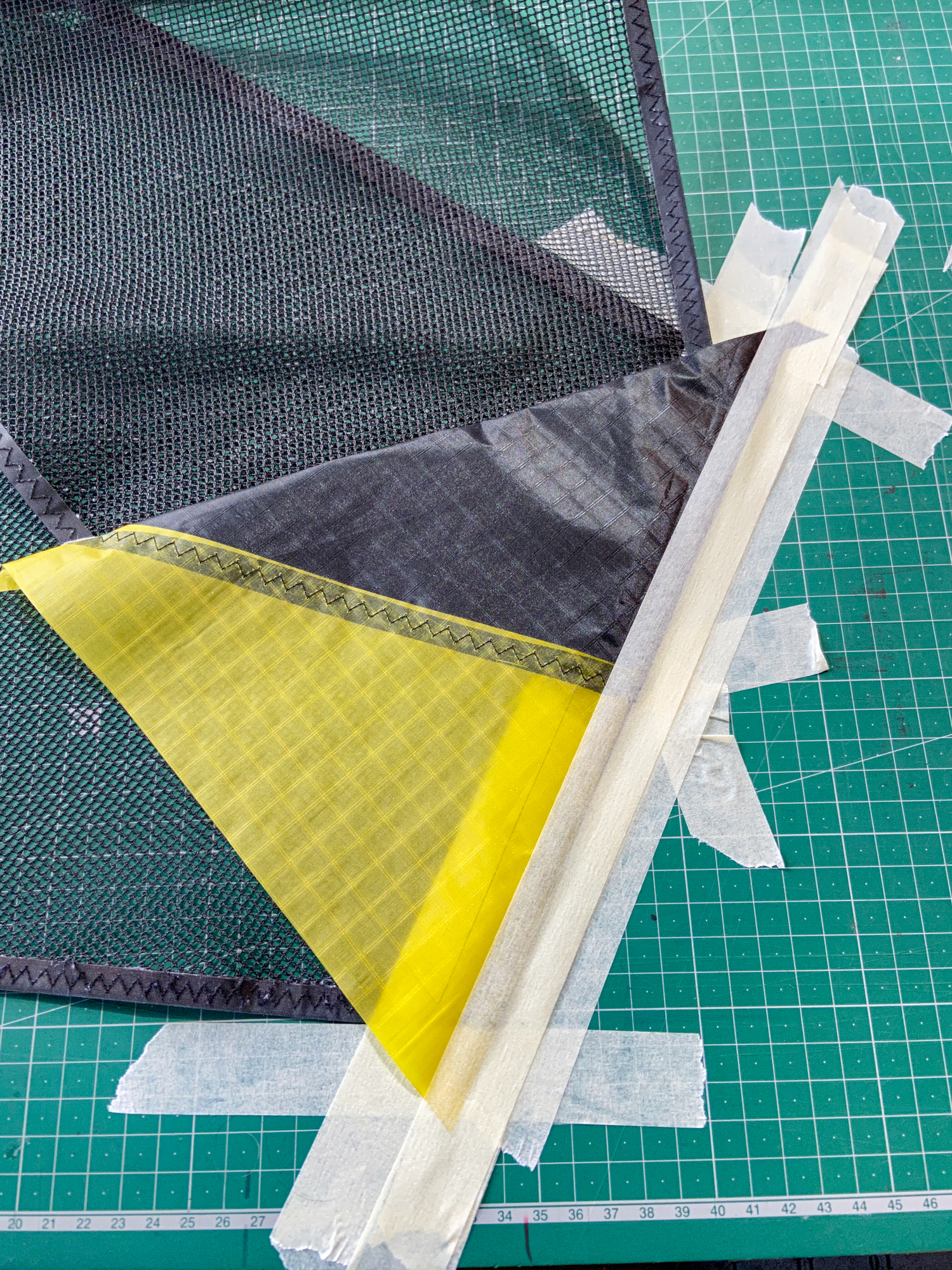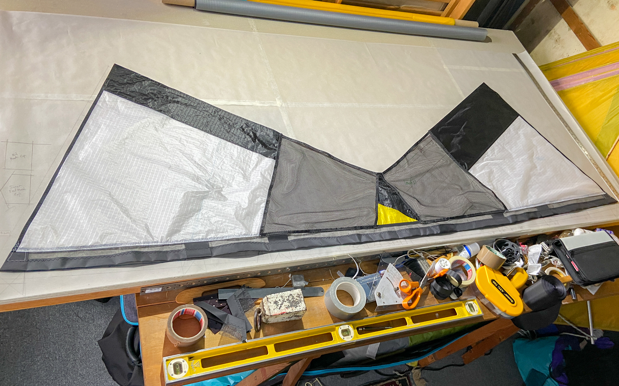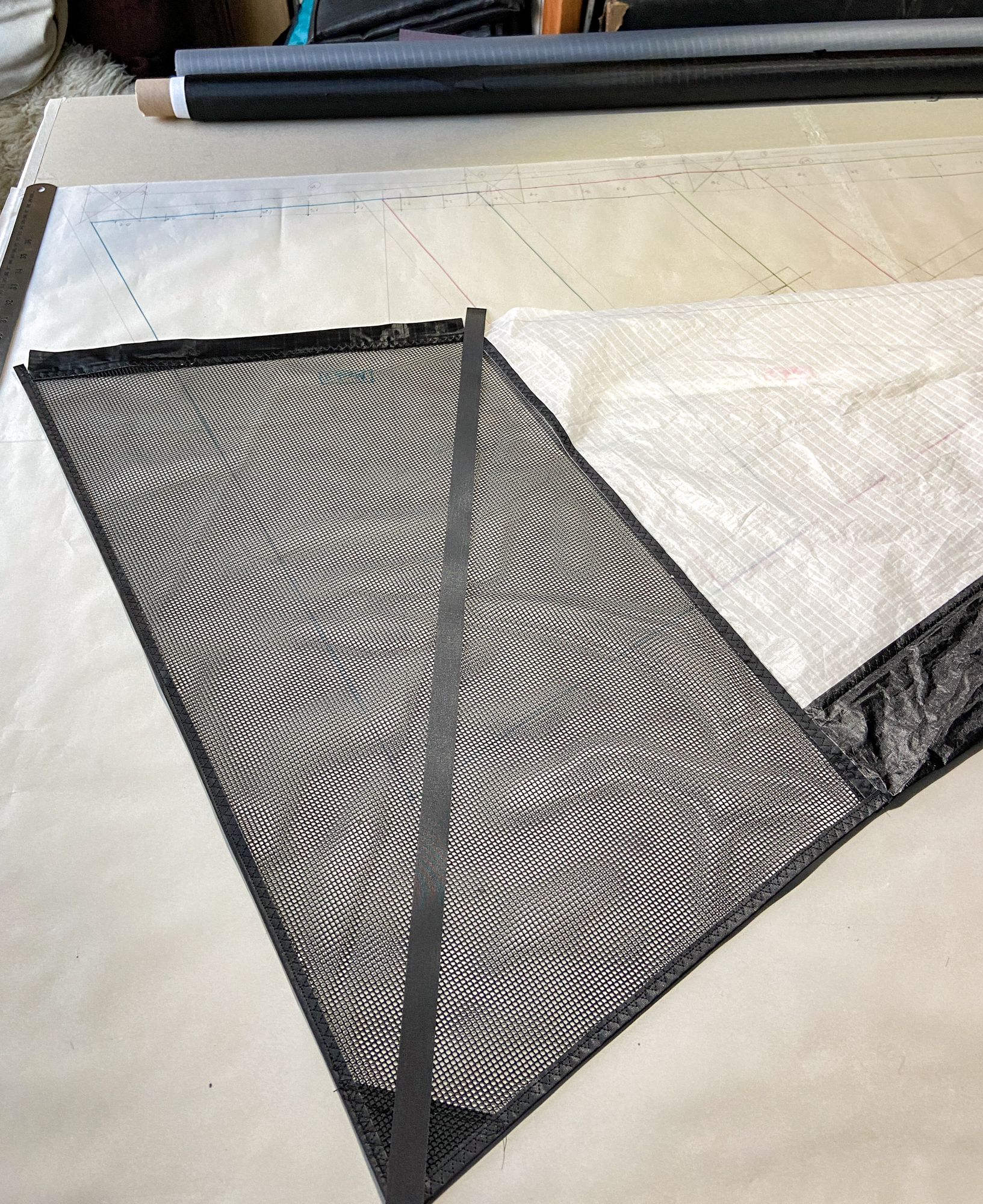 Sewing onto the mesh panels was complicated as the dacron element had to be secured and aligned. Main edges tacked ready for sewing, 18th October 2022.