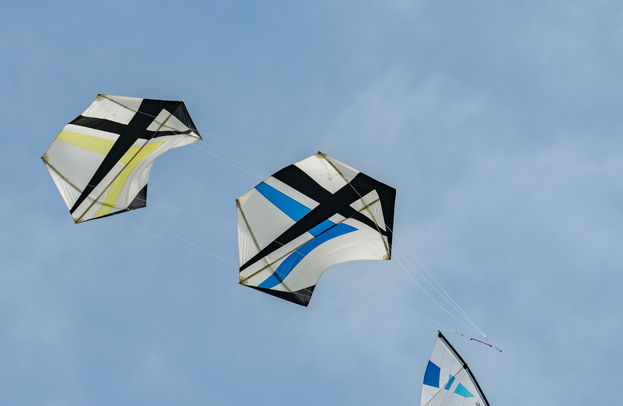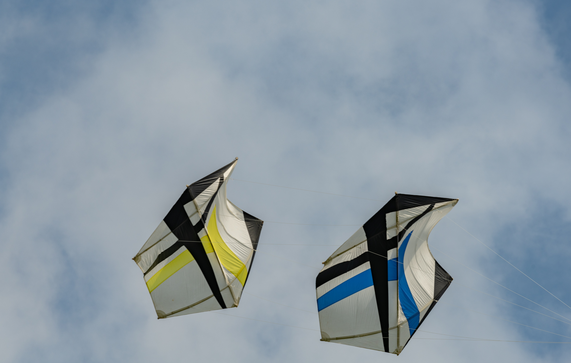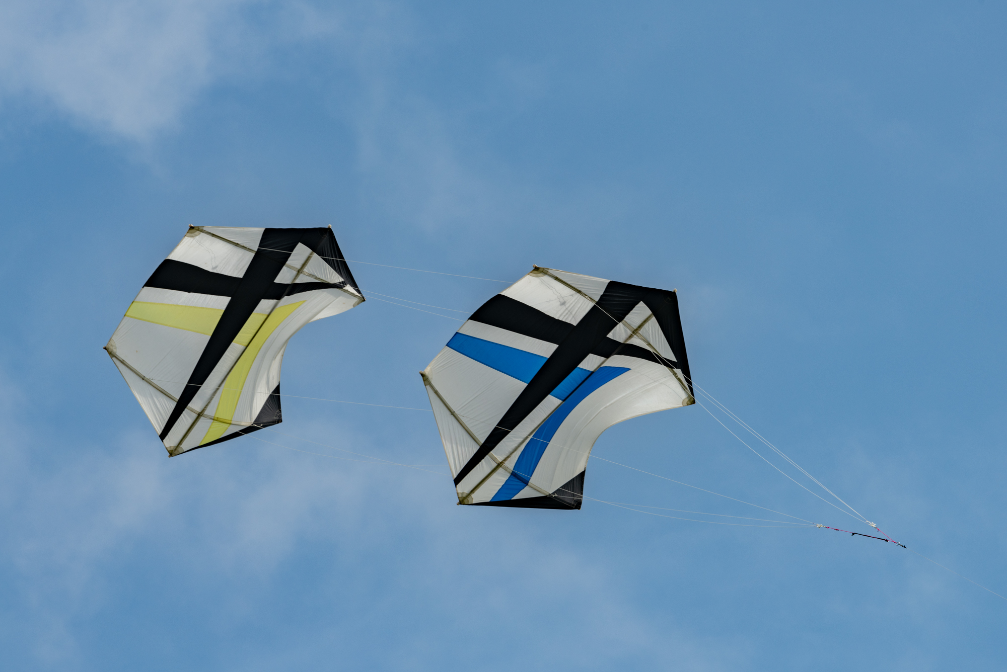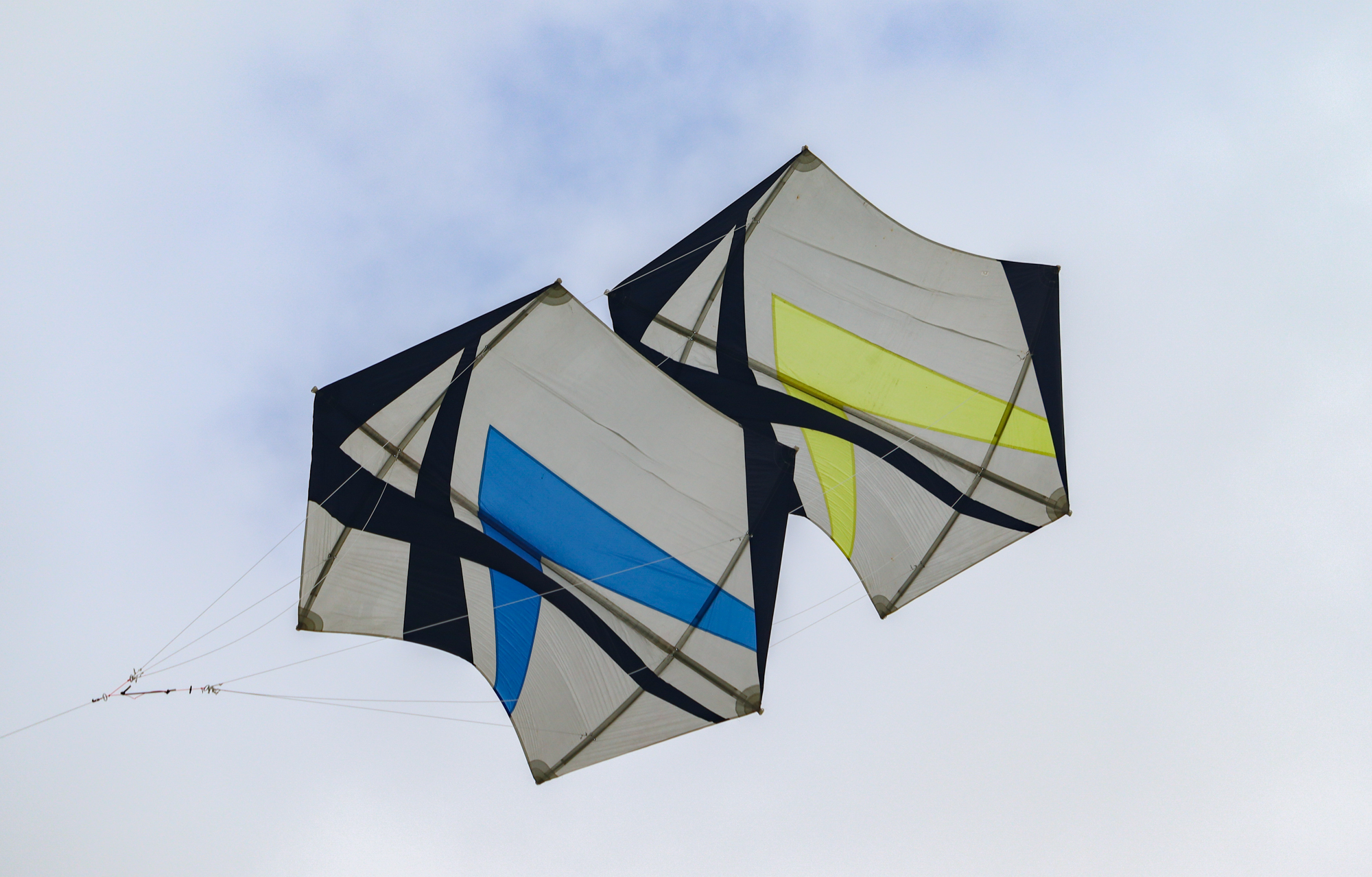 Bridle test flight for the dark blue sail. Both kites have a peg in the top bridle set. Yellow, one clove hitch, blue, one clove hitch plus 1/2 hitch!