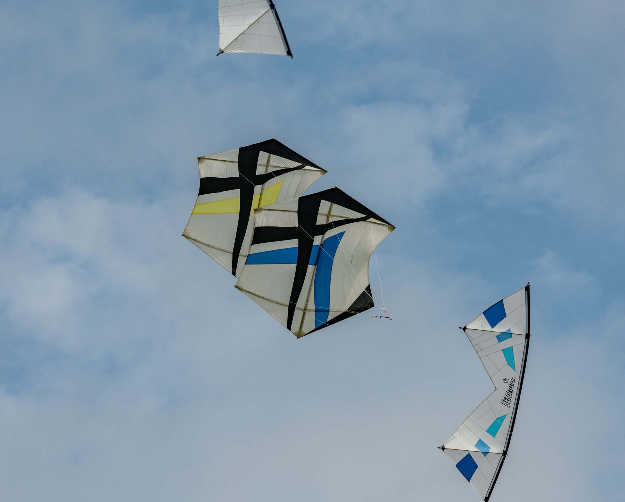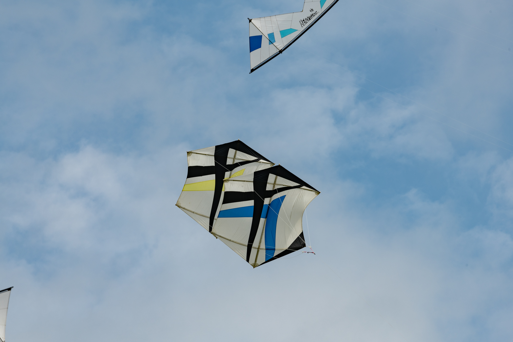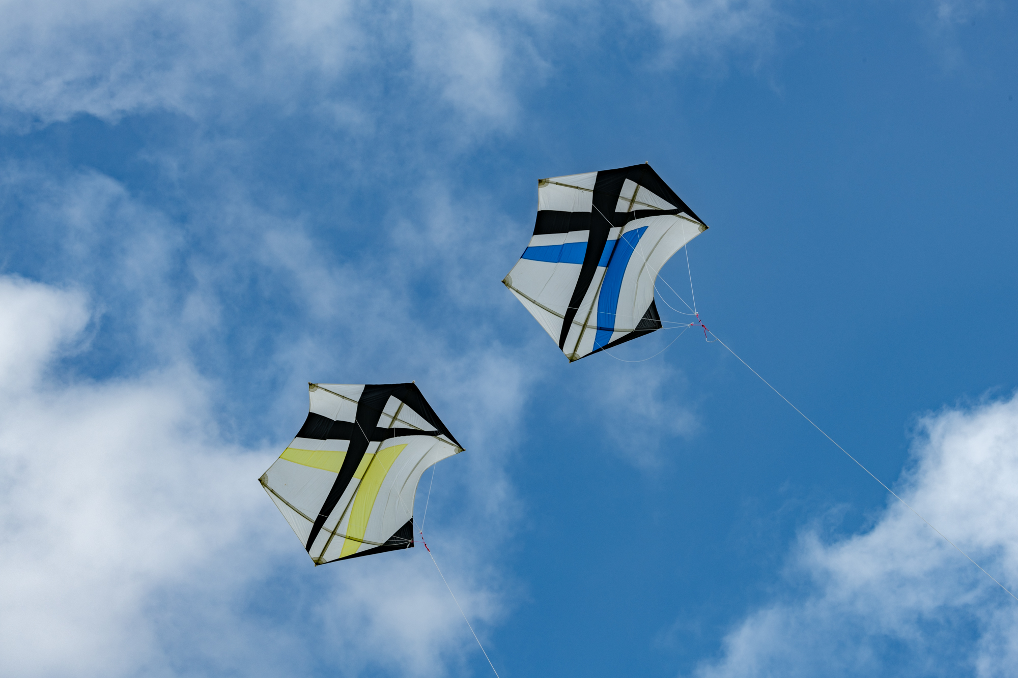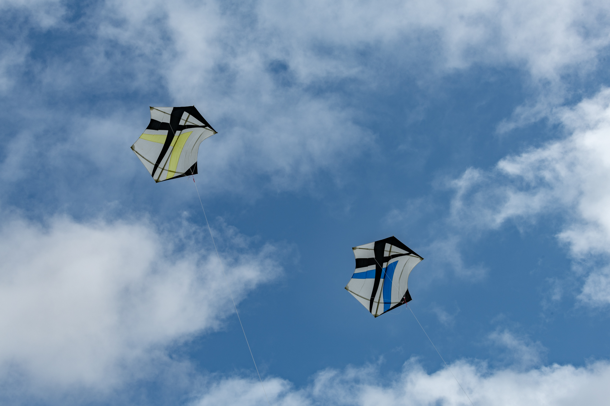 Bridle test flight for the dark blue sail. Both kites have a peg in the top bridle set. Yellow, one clove hitch, blue, one clove hitch plus 1/2 hitch!
