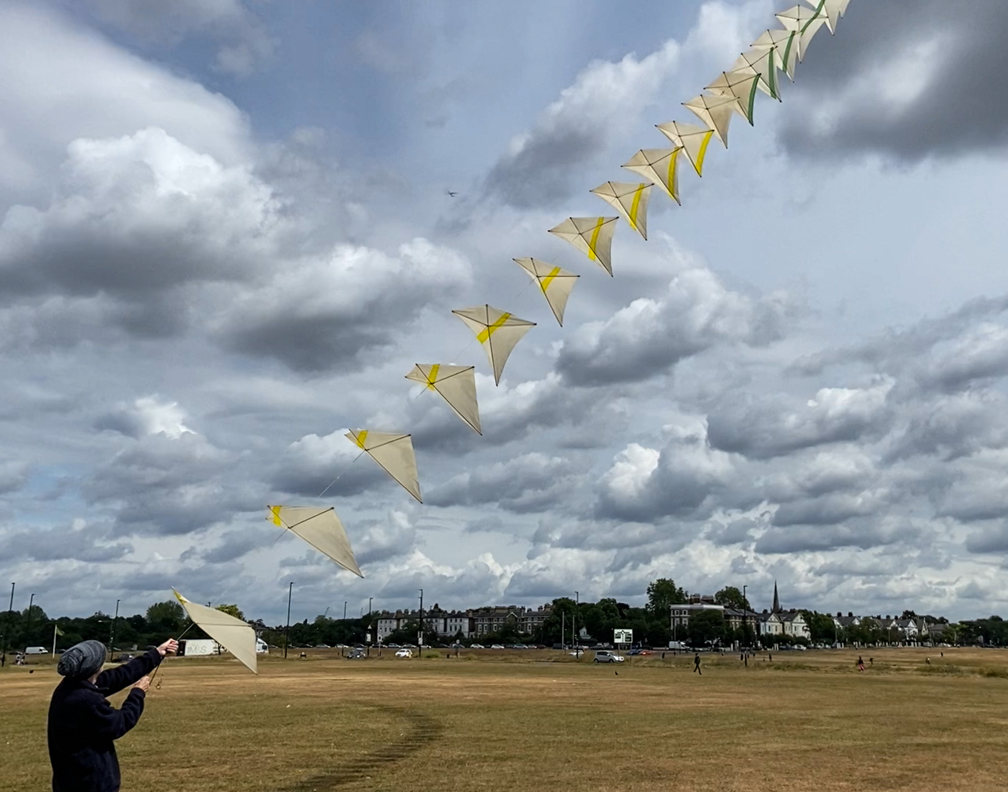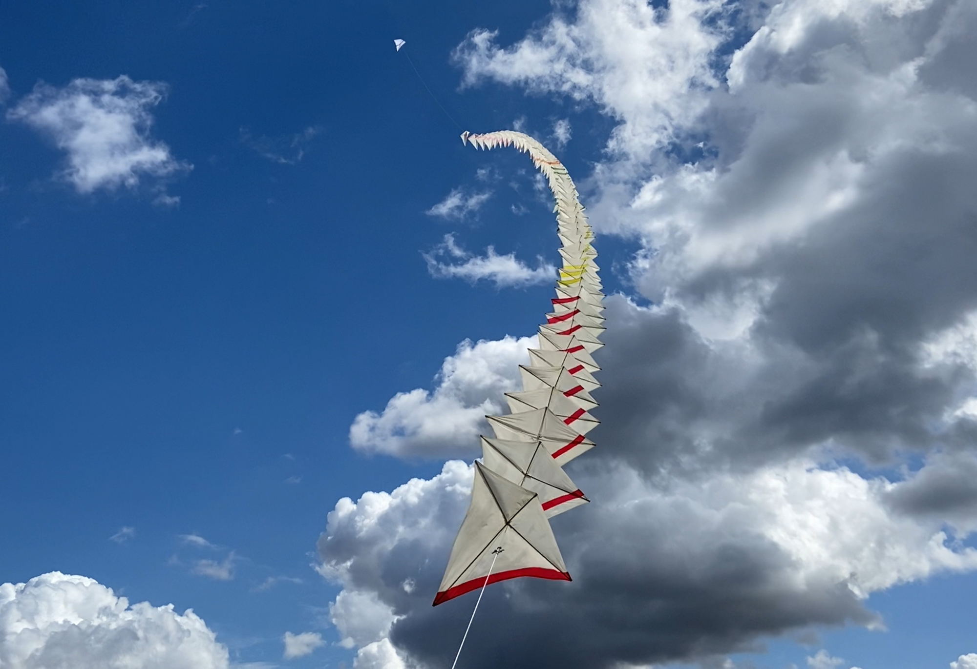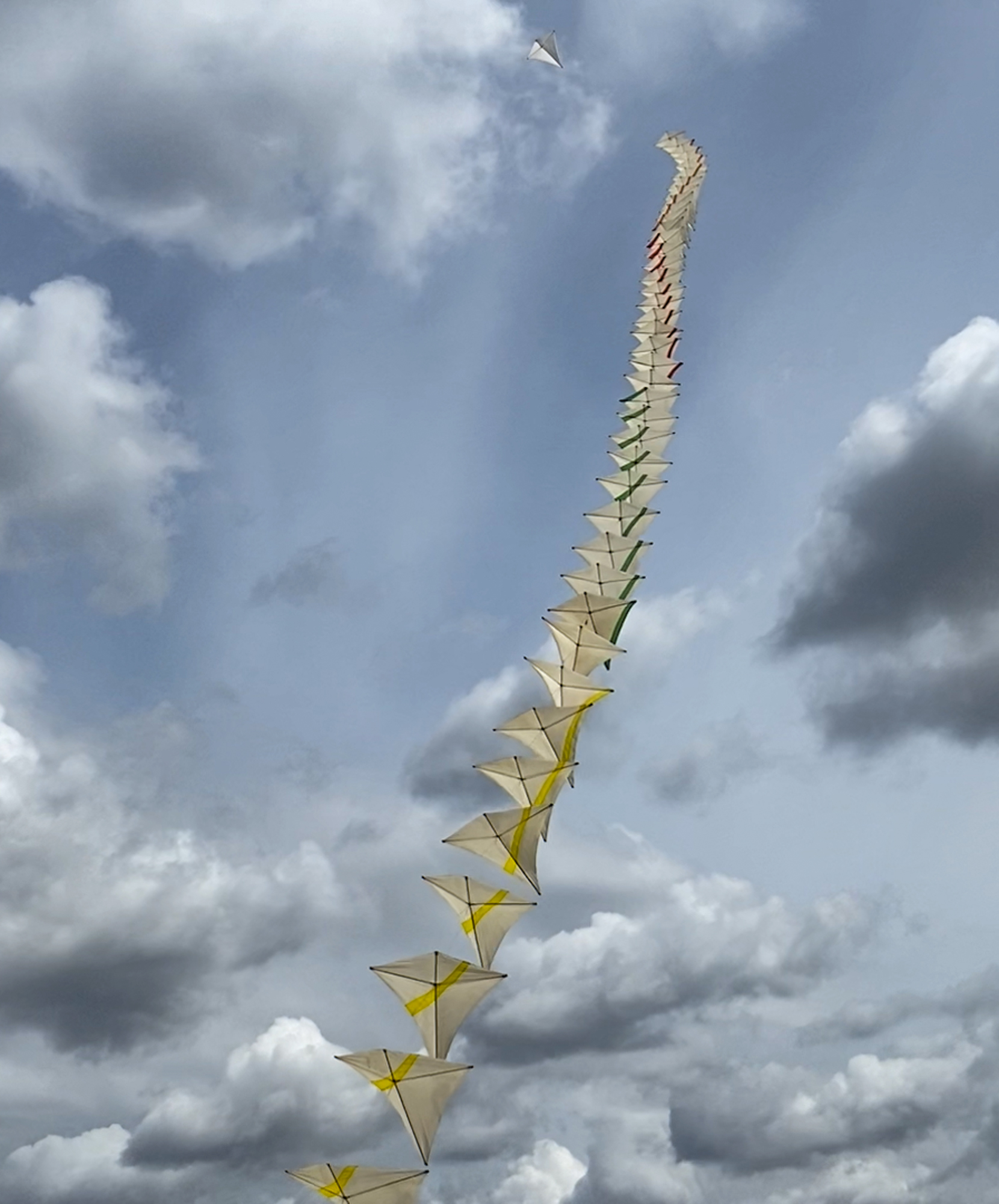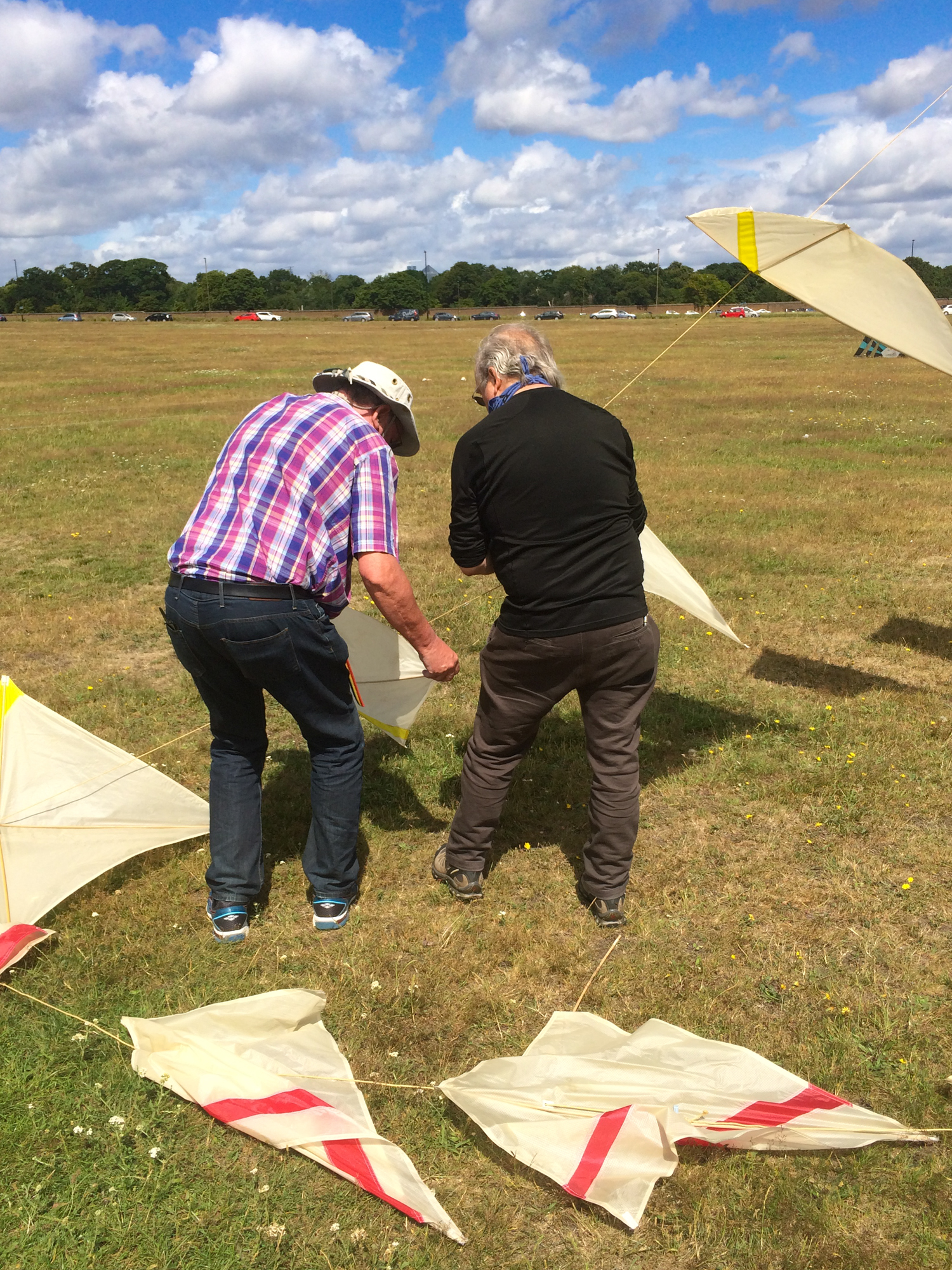 The sails had been stored with the spreaders in place. That and having probably been flown in strong breezes meant that the fabric is quite stretched. There was a split seam in one of the pink sails which has been re-sewn. Many of the spar pockets look as if they are newer than the original fabric. The kevlar line is heavily knotted at the connector points and some of the carabiners are slightly corroded or discoloured.