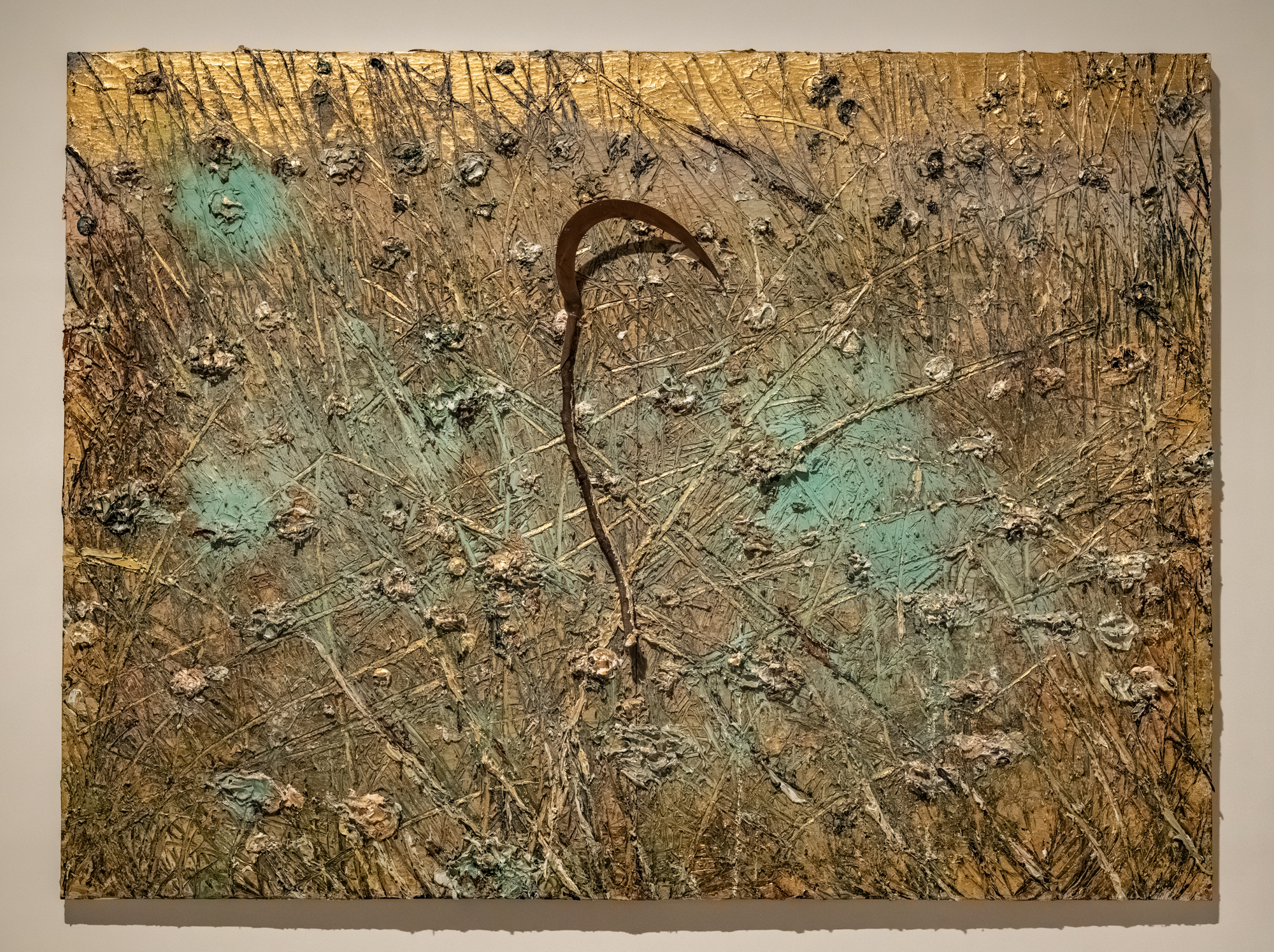 emulsion, oil paint, acrylic, shellac, gold leaf, metal wire, and scythe 280 x 380 cm