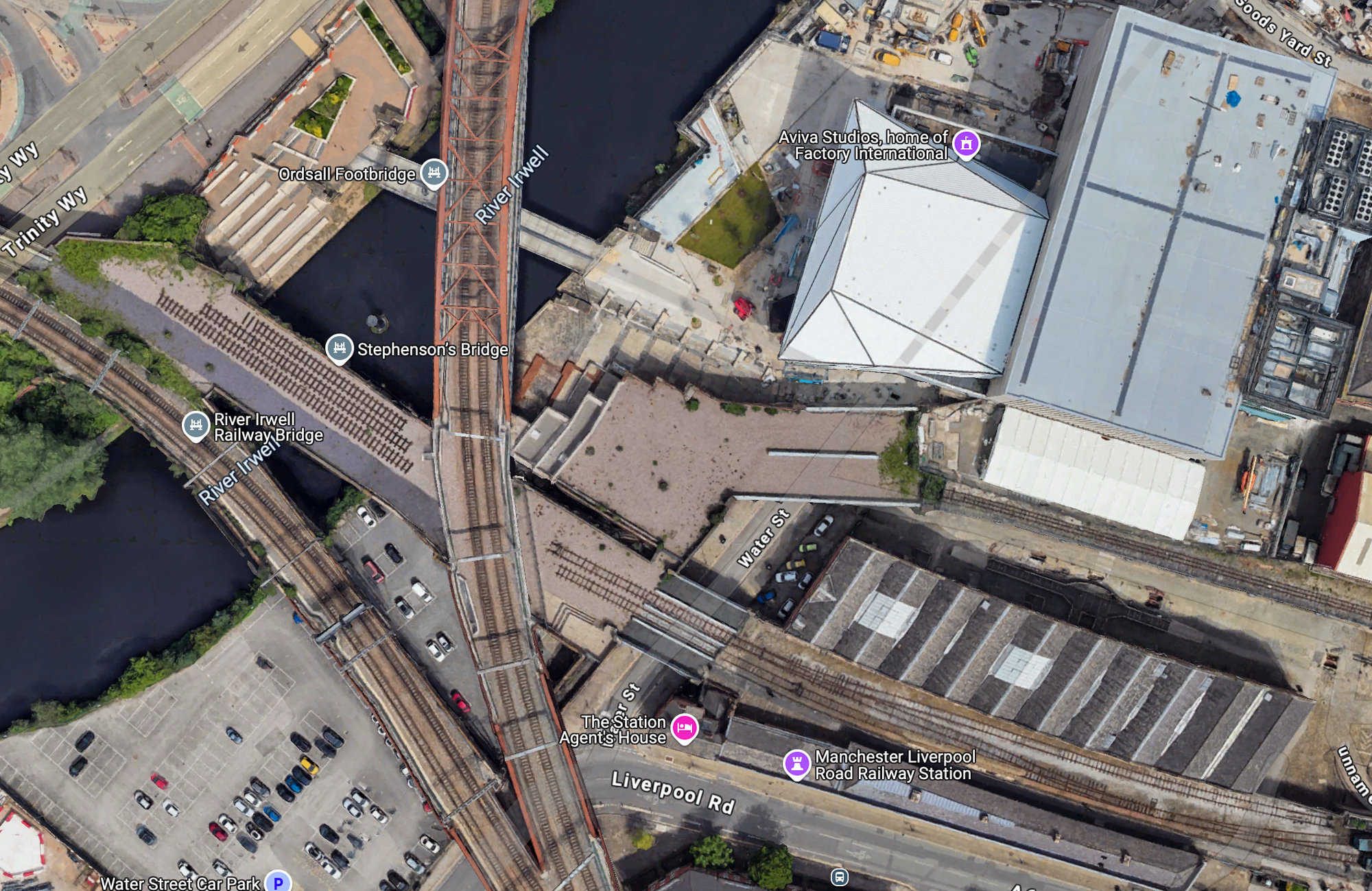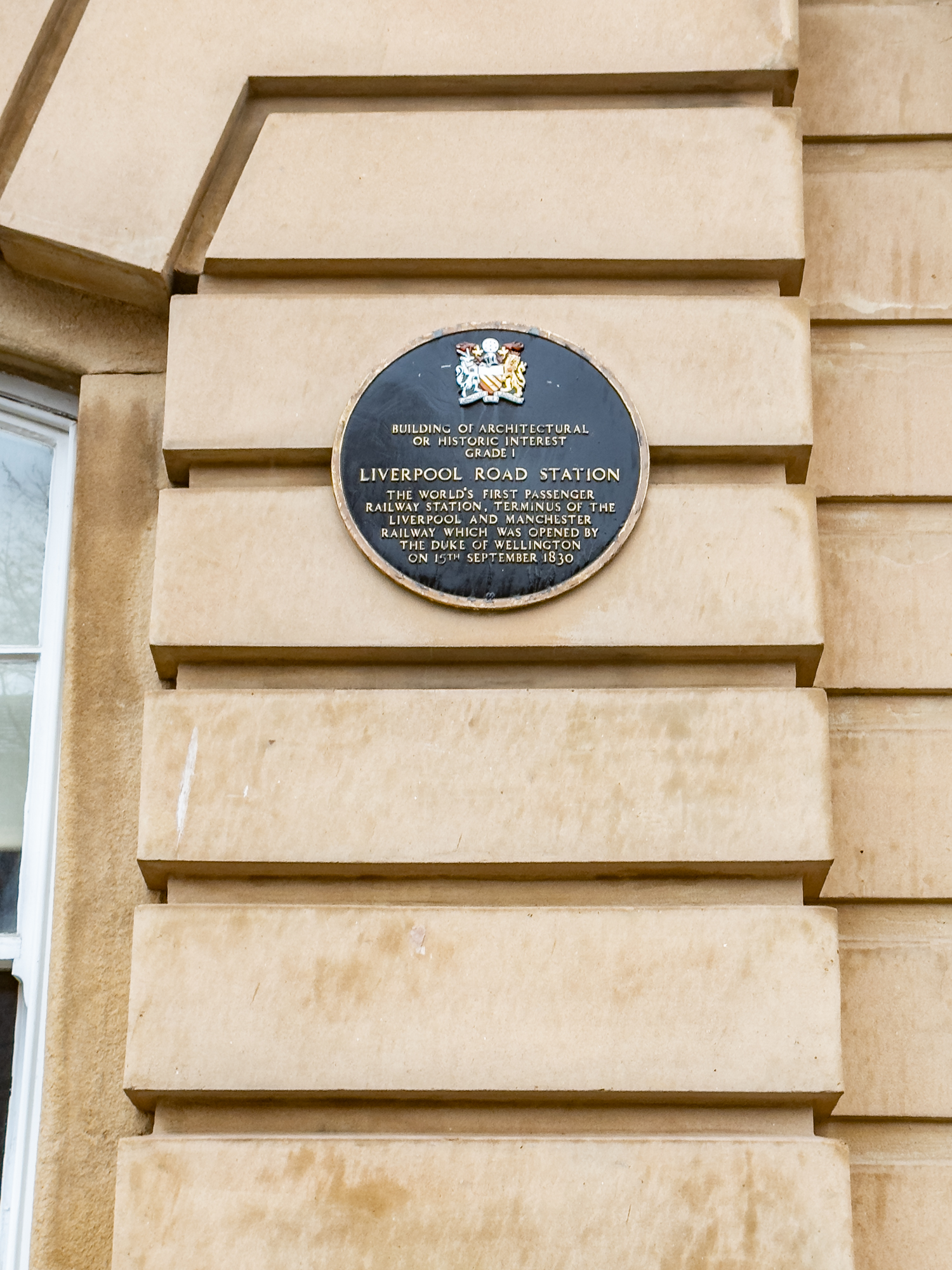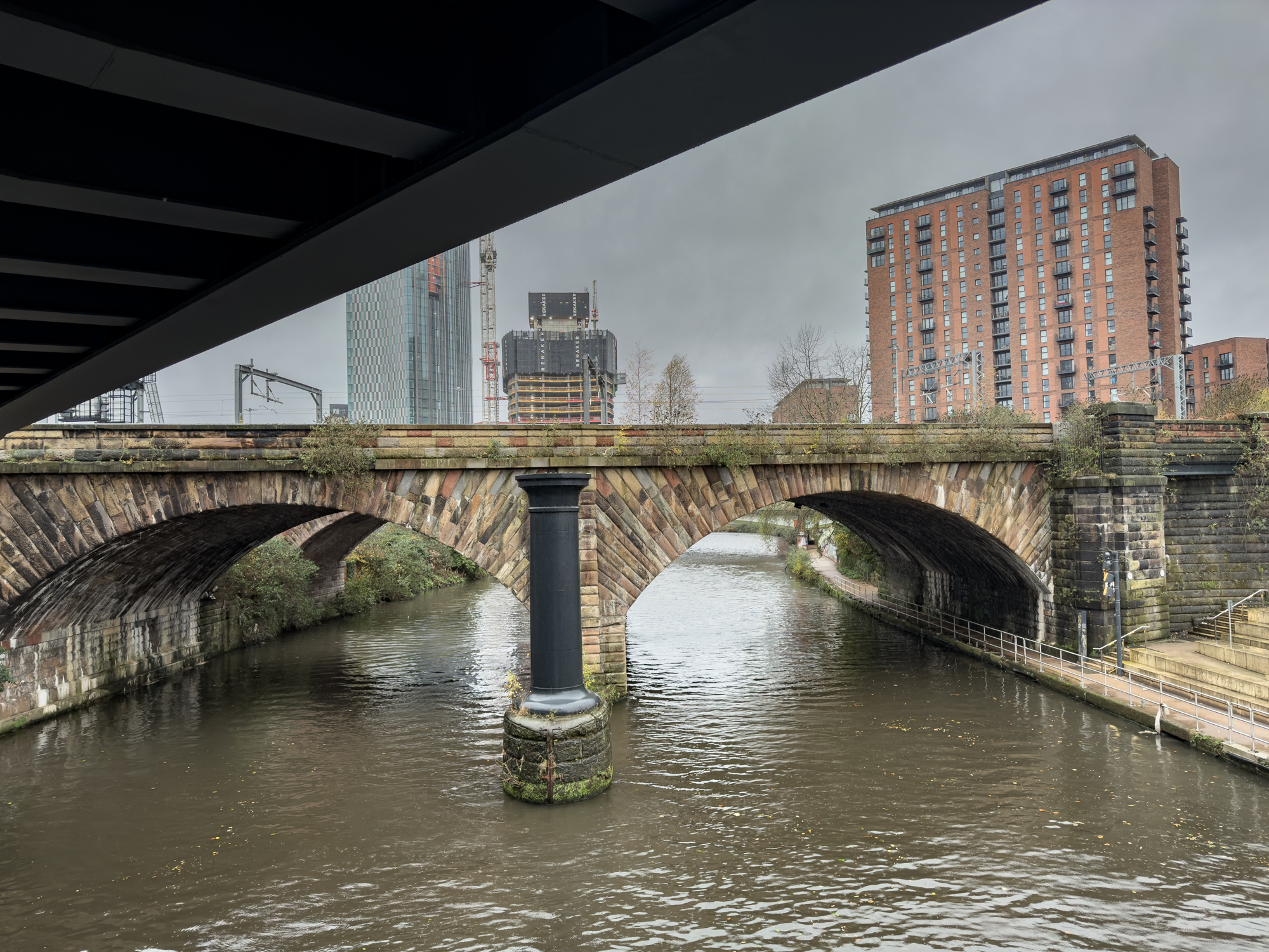 I had wondered if this isolated pillar was part of the original Manchester/Liverpool railway bridge. The entire bridge is actually Stephenson's Bridge and is a listed building. 'This is an 1830 stone railway bridge crossing the River Irwell. It is of special architectural and historic interest due to its early date, intactness, and design by George Stephenson, the nationally renowned railway engineer.'