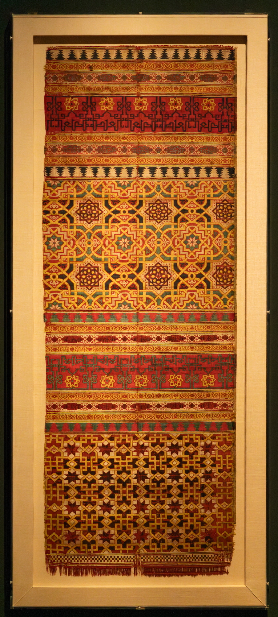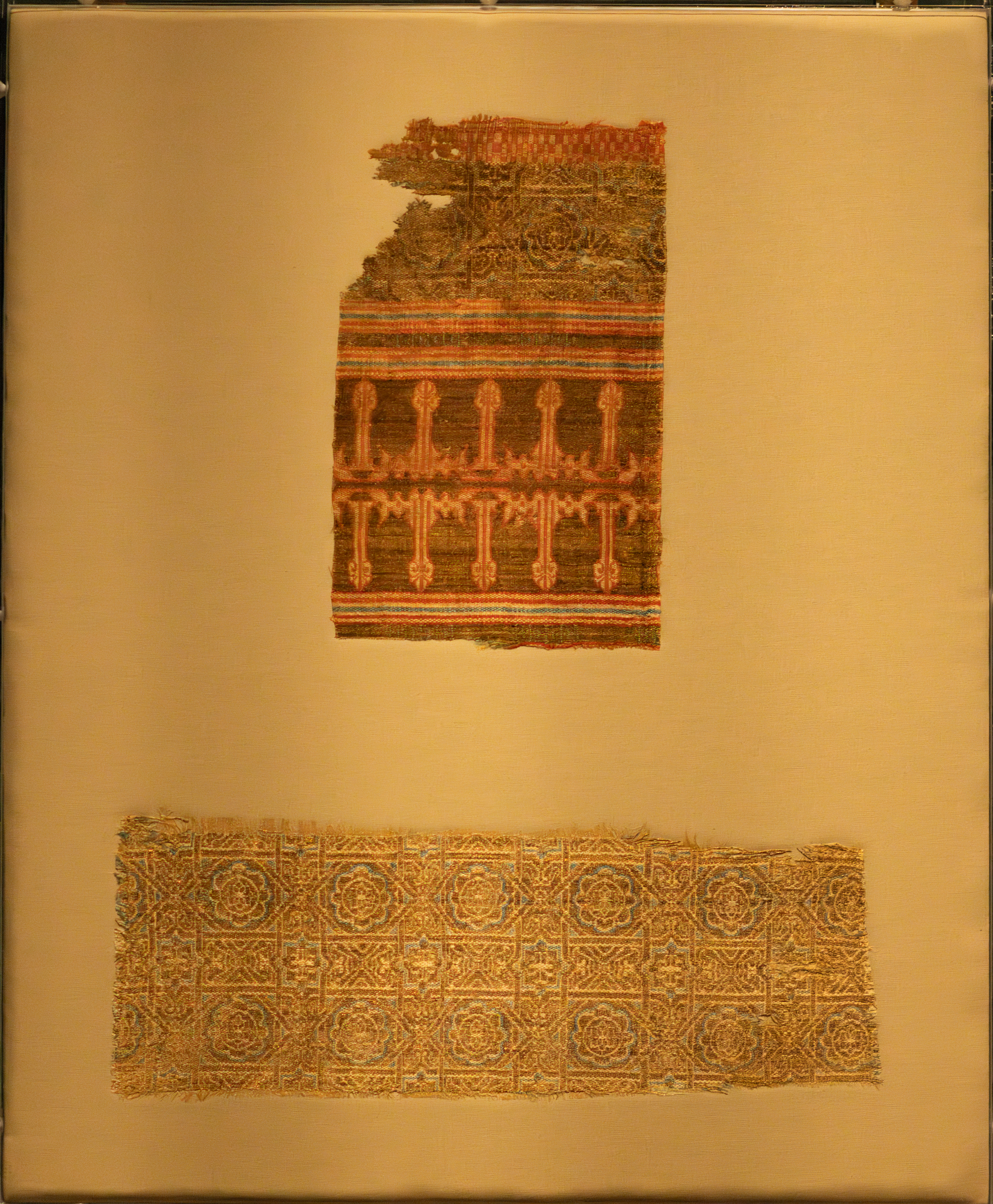 Textile fragments with a geometric interlace design, one featuring a mirrored Kufic inscription