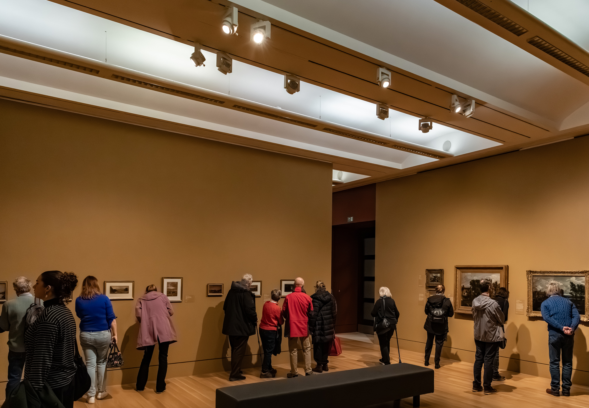 The first two rooms show the paintings under normal electric lighting. The rest of the exhibition is part illuminated with florescent lights with a very limited spectrum.