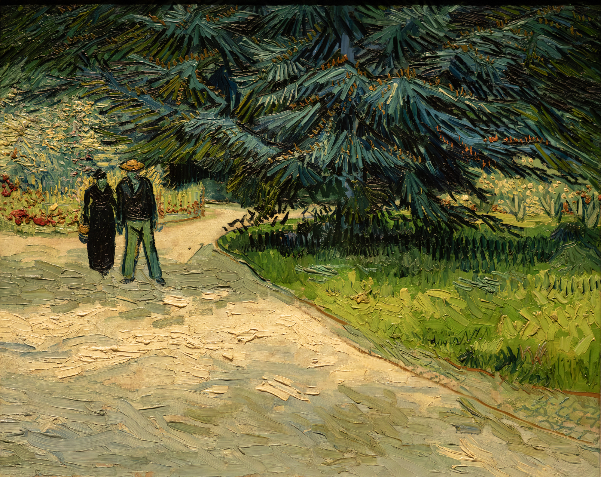 This very simple corner of a garden is enlivened by beds of orange lead geraniums in the background areas, under the black branches. Two figures of lovers stand in the shade of the big tree'.